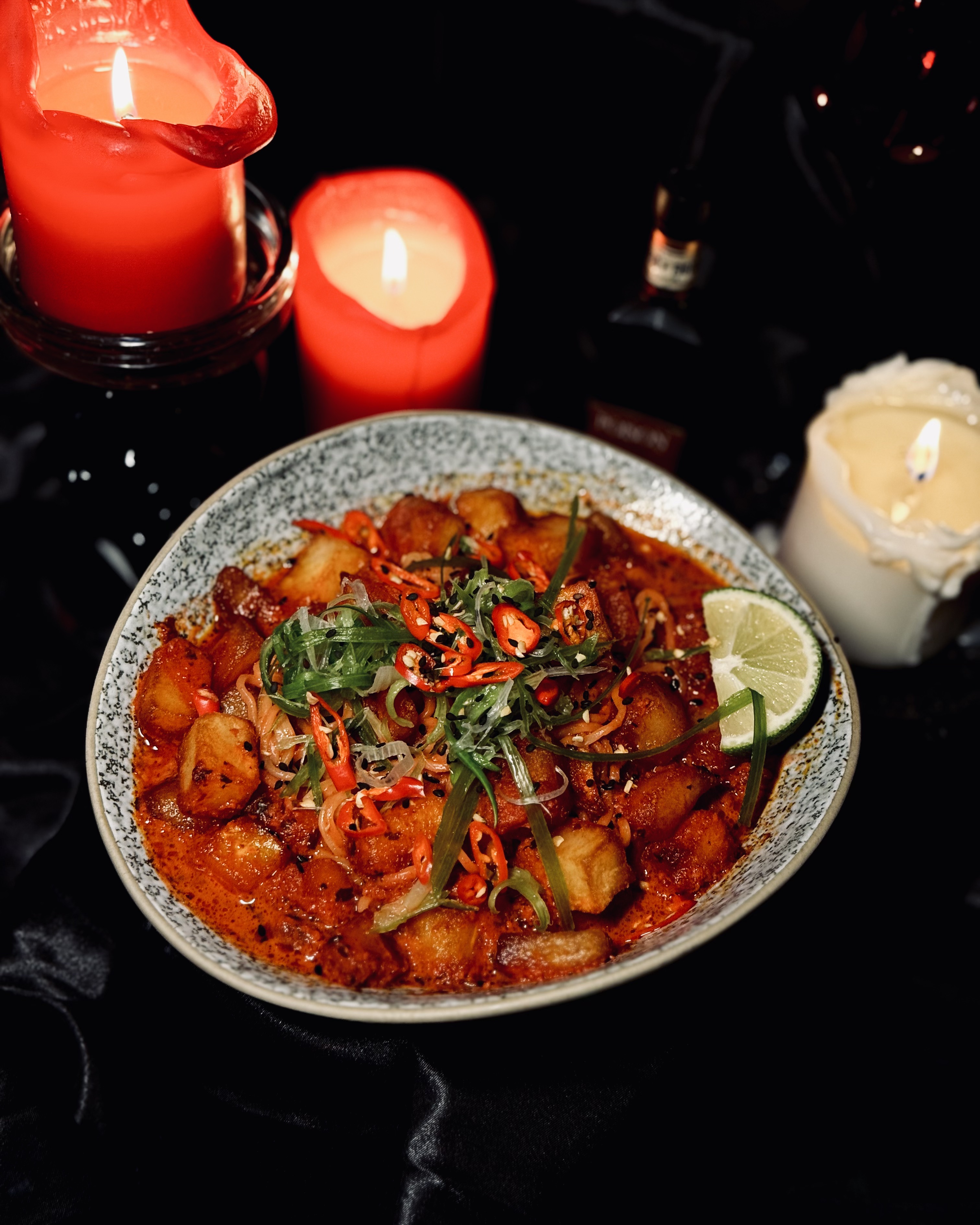 A seductive Thai coconut curry of coconut cream, red chilli, lemongrass, lime, galangal, coriander, and cumin, poured over blanched noodles and potato, finished with green onion, chillies, and black sesame. Smooth, fiery, and dangerously tempting.